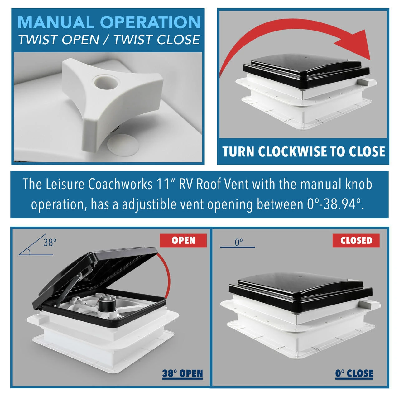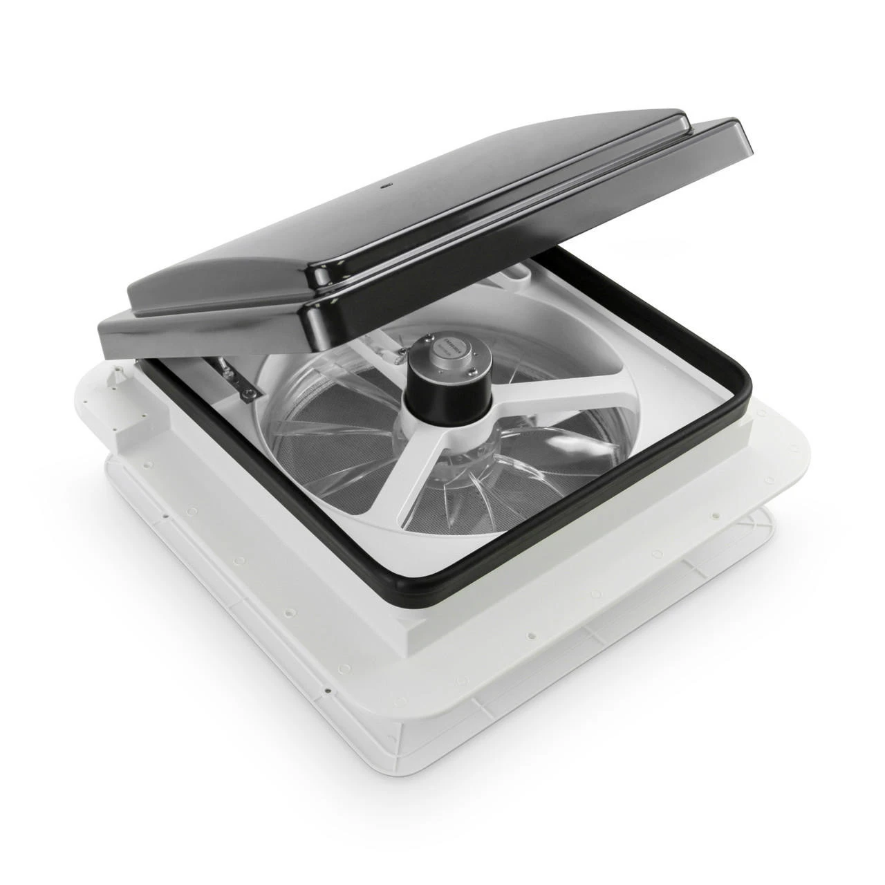 Do you need a powerful, quiet, energy efficient fan for your RV? This 11” X 11” RV Roof Vent Fan is a great choice. It has a built in LED Light and black lid. It uses 12 volt power and the 10-inch blade runs quietly.