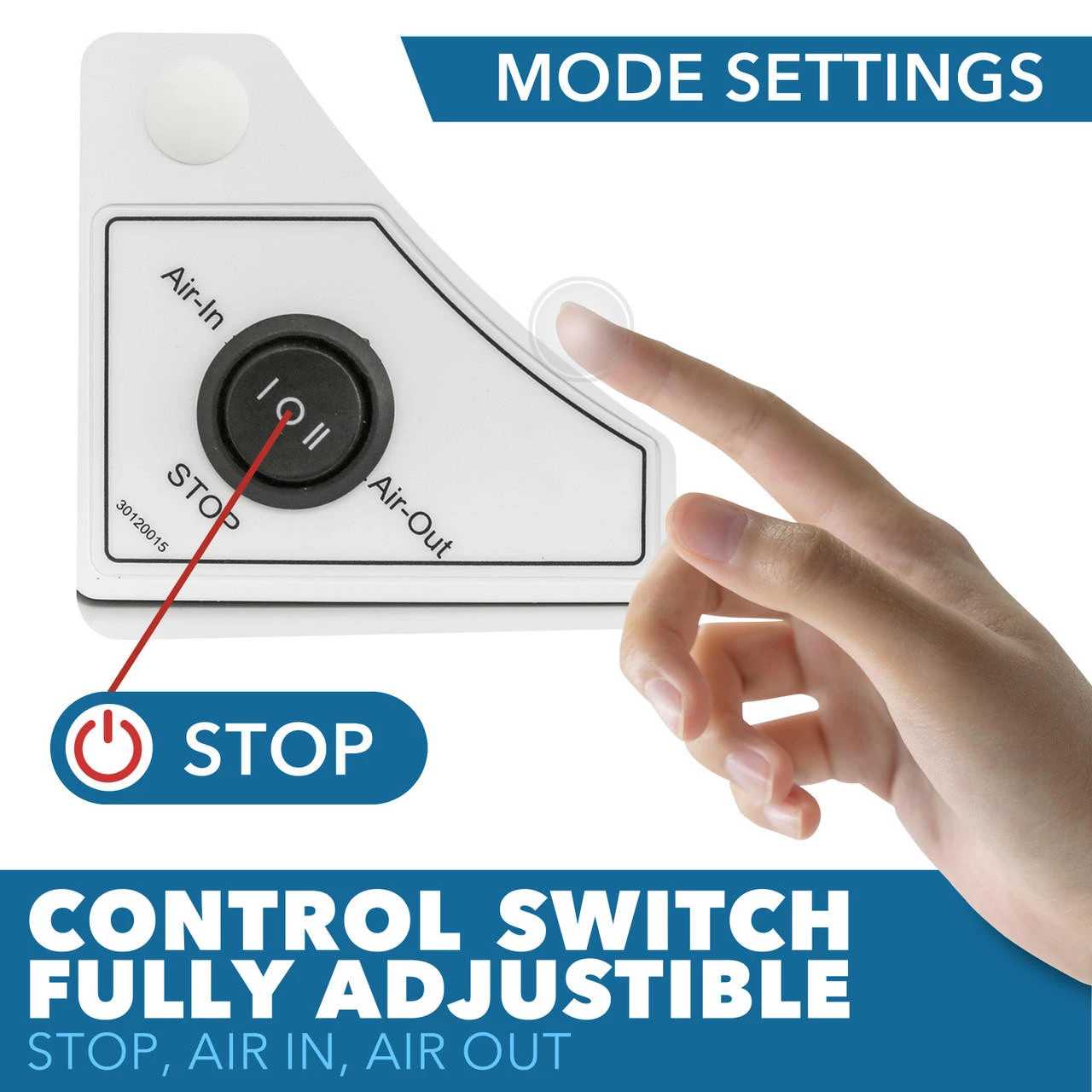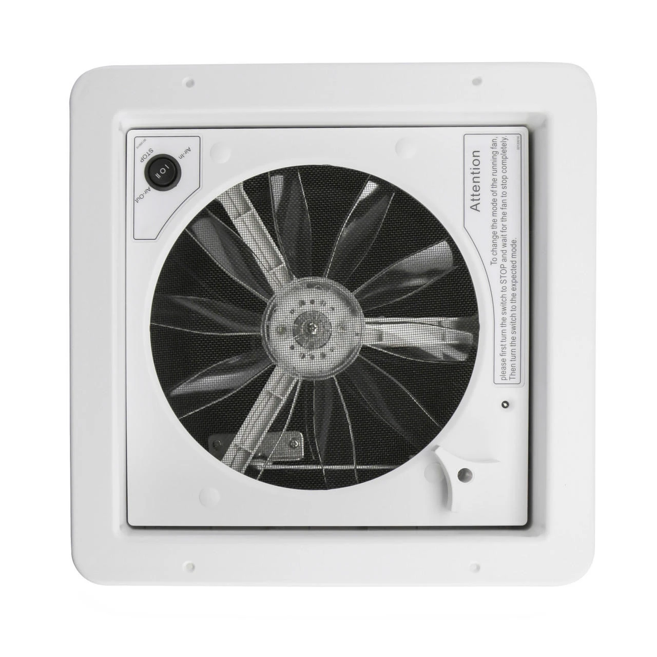 This fan is reversable and features one speed in and one speed out. Alternate between cycling stale air out and bringing fresh air into your RV or trailer. There is a built in switch on the vent to move between settings. You can also open and close the hood with a manual riser.