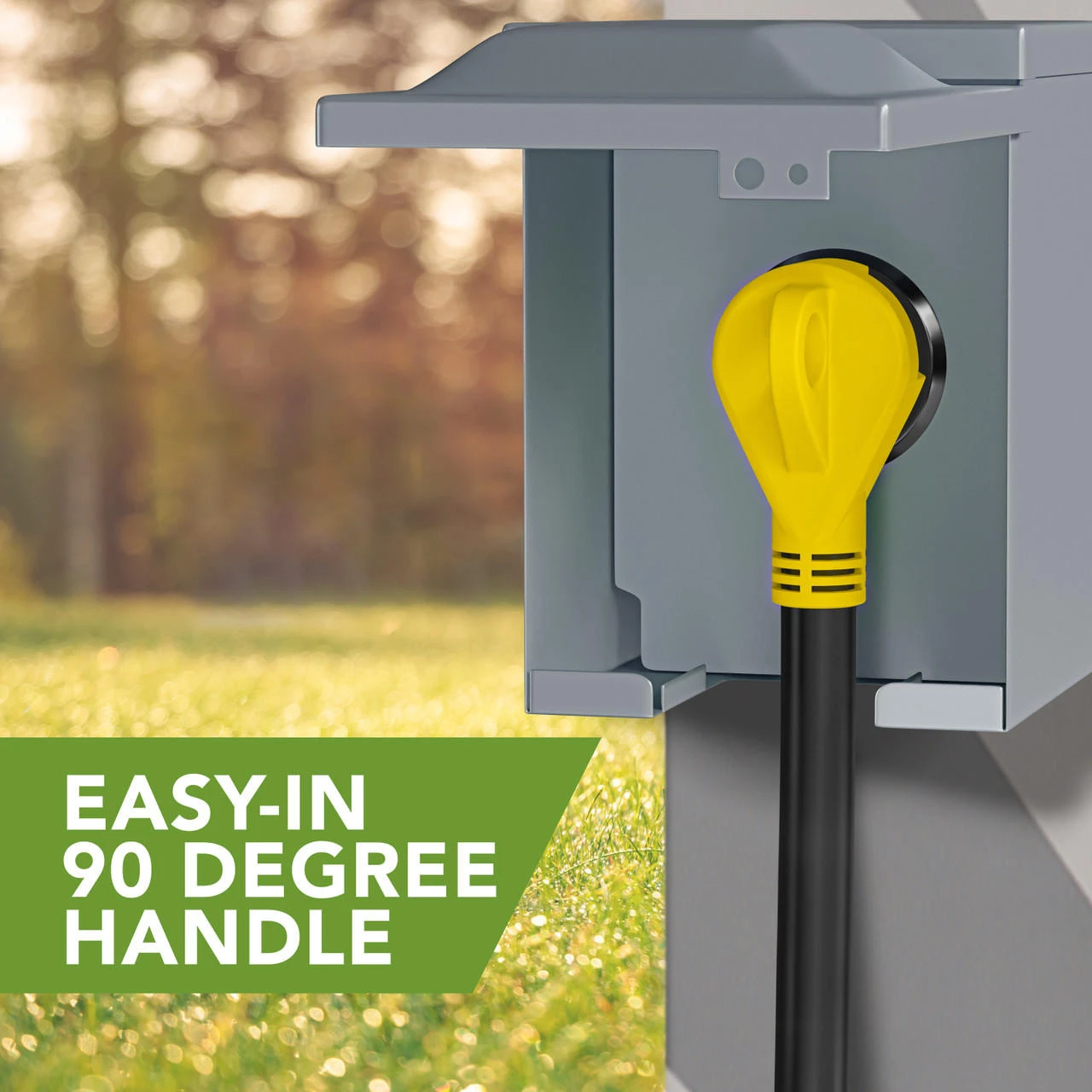 It’s got a handy and easy to use pull handle molded right into the male plug, and also comes with an RV adapter, so you can use it for nearly anything you need to power. It’s also got a built in LED power indicator. So, you can tell just by looking at the plug whether you’ve got live power or not.