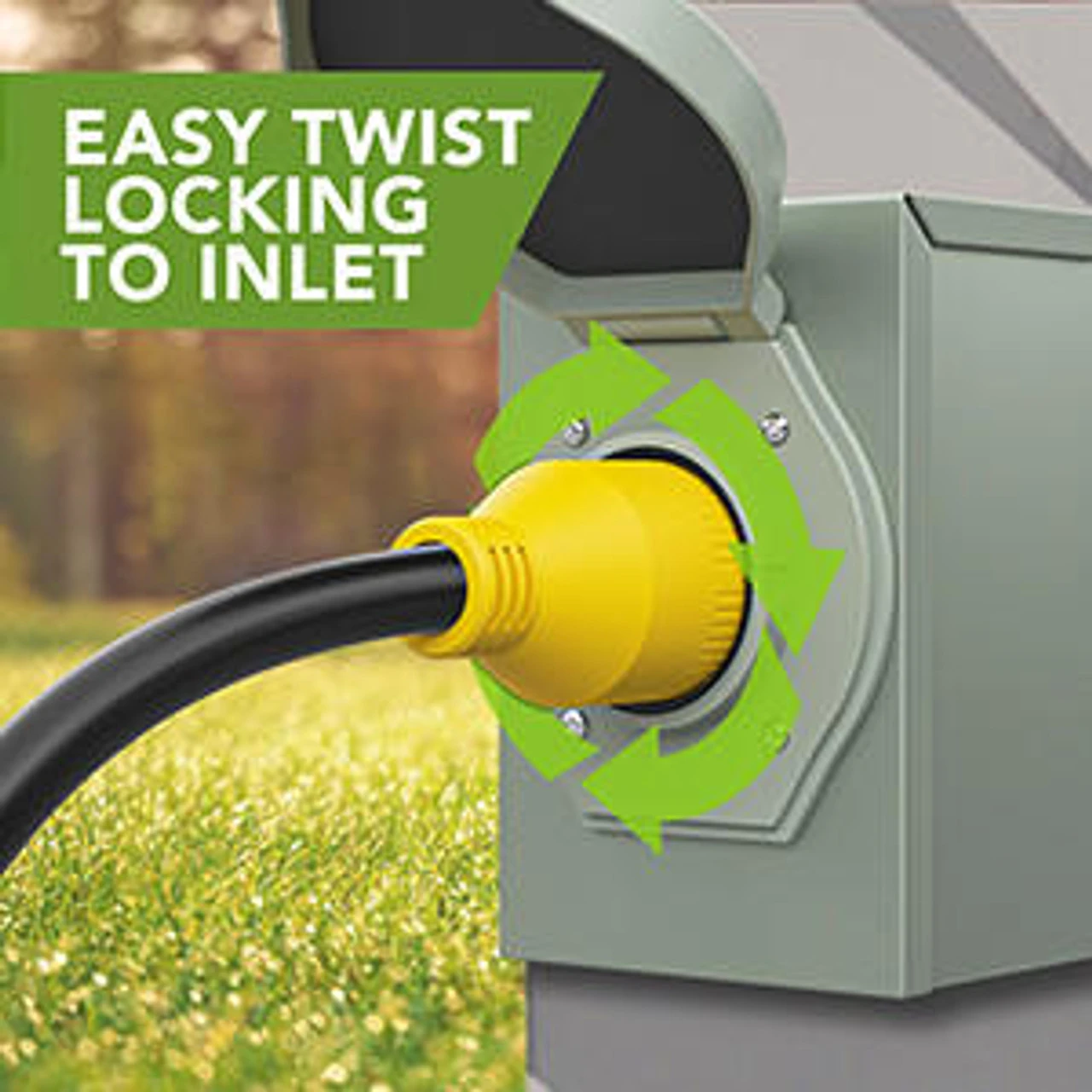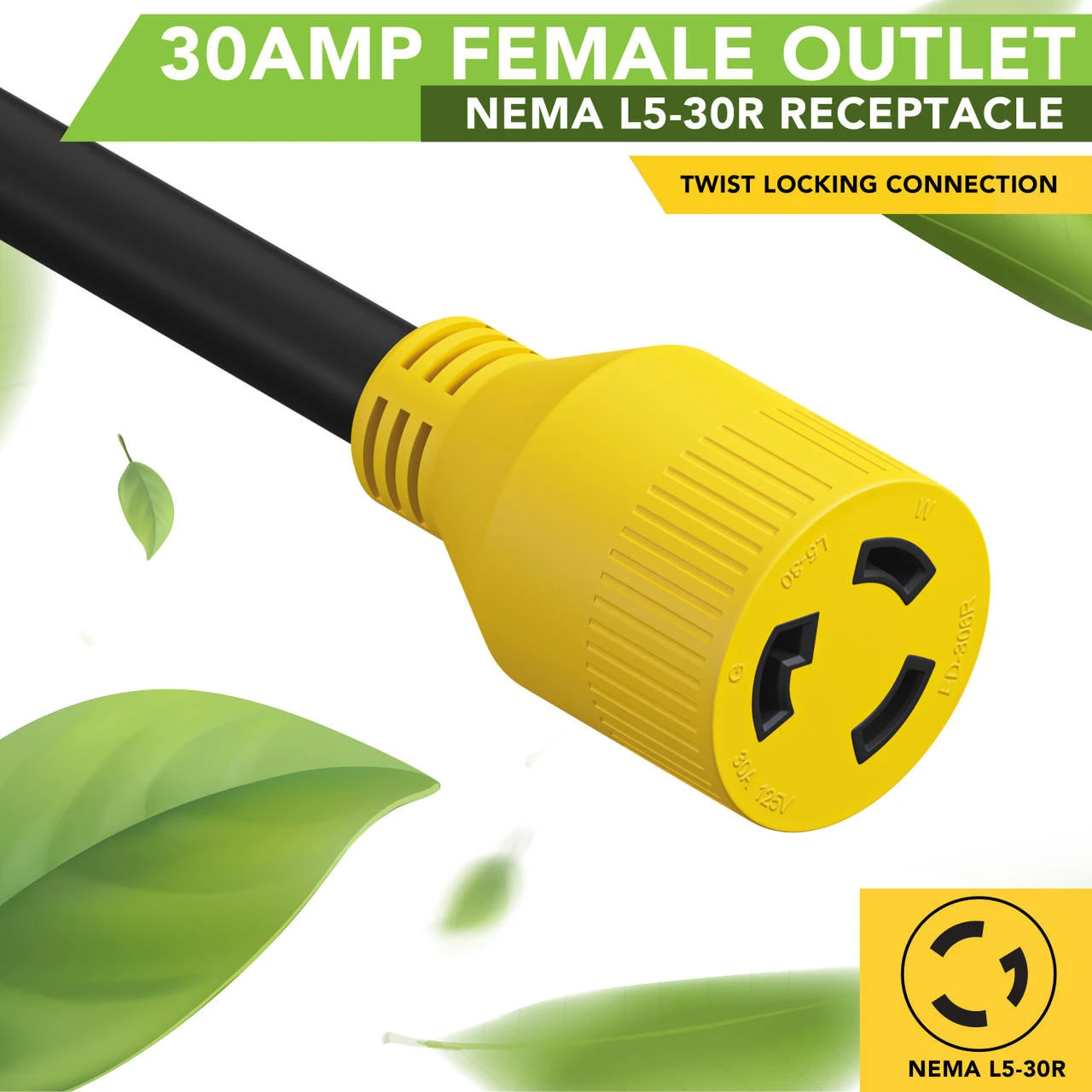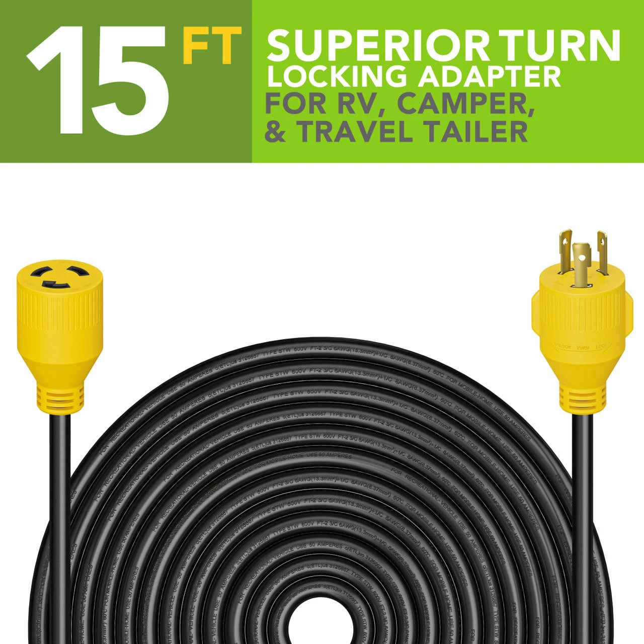 This 15 foot, 30A 250V L5-30 locking extension cord is a fantastic all round power cord option you’re your RV, trailer, motorhome or workshop.