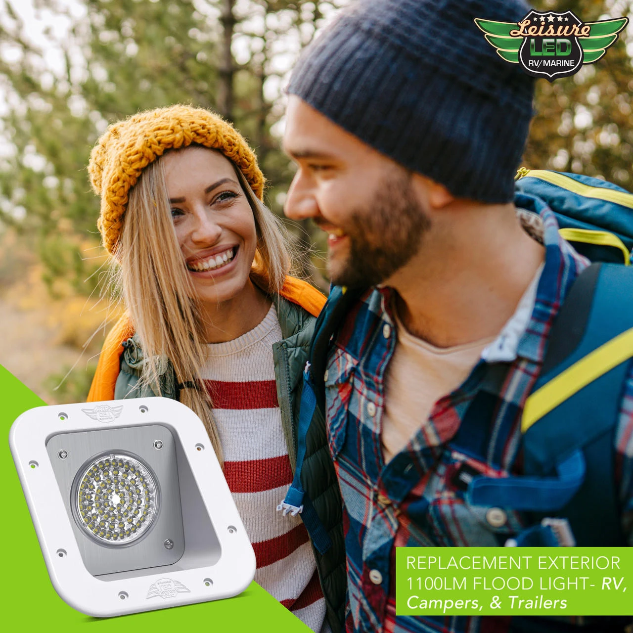 The Leisure LED Exterior LED Flood Light is a high-capacity RV/trailer/toy hauler tool that simplifies livelihood, maximizes service, and intensifies performance all at once. Leisure LED 1-Year Warranty Weekend Warrior LED Flood Wall Mount Light 1100 Lumens Made with Environmently friendly technology and materials.