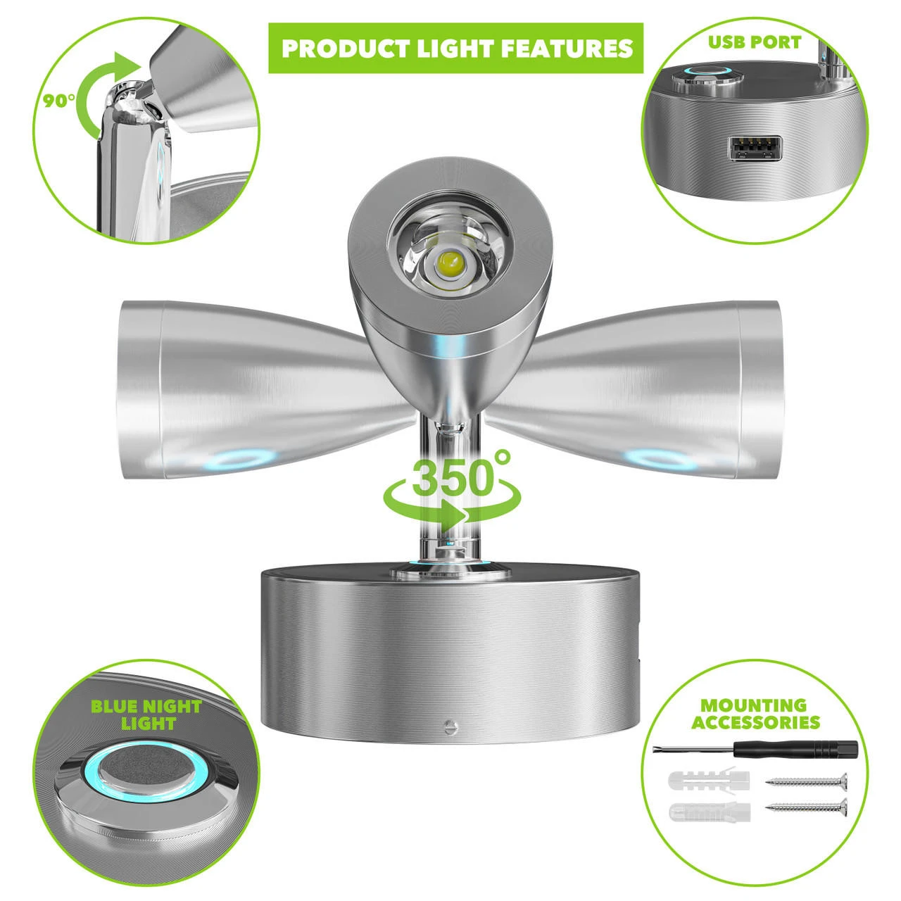 USB CHARGER- Light is equipped with a USB port to charge all your devices- smartphones, tablets, & other electric devices. Devices that are plugged into the USB port will continue to charge even when light has been turned off. If replacing another reading light that has a pre-existing mounting hole that is larger than 1-3/8” this light will not cover that hole and require a cover plate (not included).