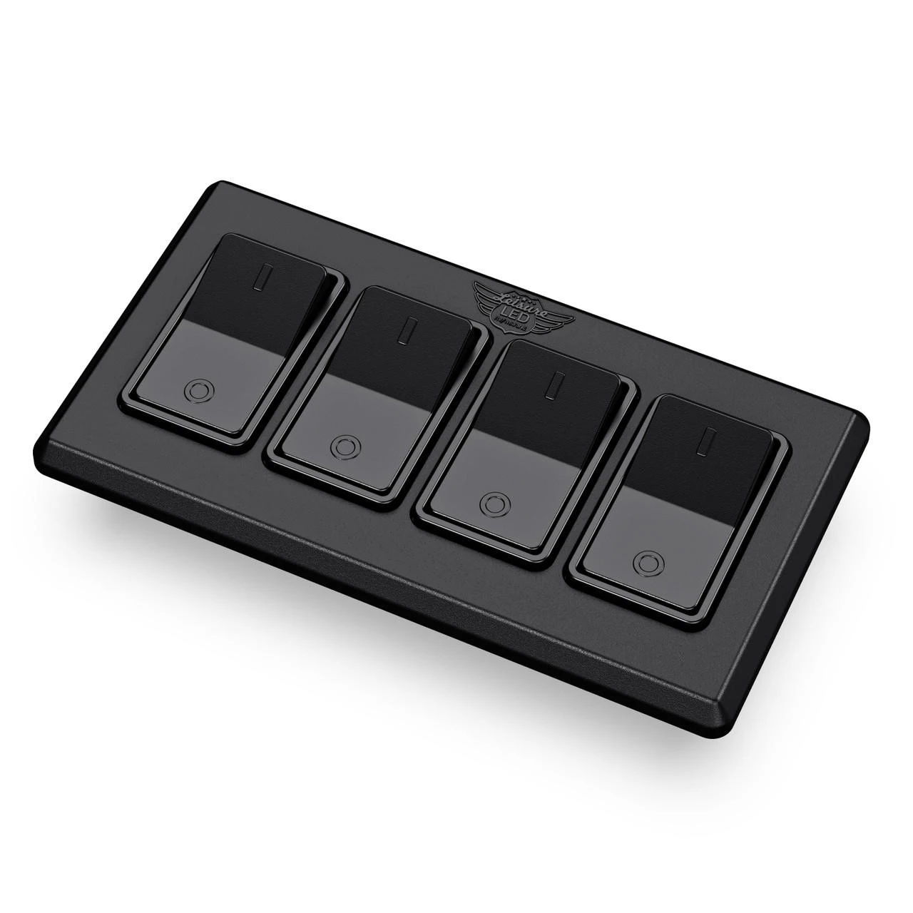 (1) RV 4 gang 12 volt light switch -Cover snaps over switch base plate for a clean look and easy installation and service – Includes 1 switch base and cover with on-off switch’s (as shown) -Overall Size: 2.87″ (L) X 5.31″ (W) X 1.1″ (H)-Minimum hole cut out size 4.44” (L) X 1.71” (W) X 0.54” (H)- Commonly used for lights, pumps, fans, vents and many other uses in RVs, Buses, Horse Trailer Conversions, Haulers, Travel Trailers, Boats and more.
