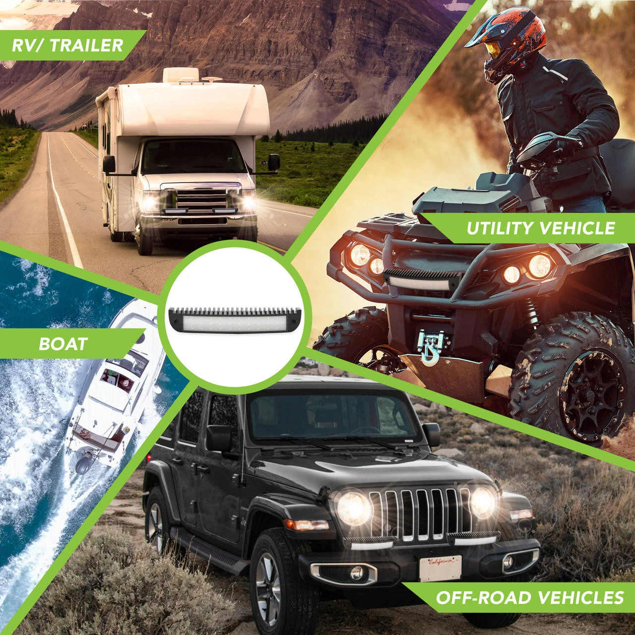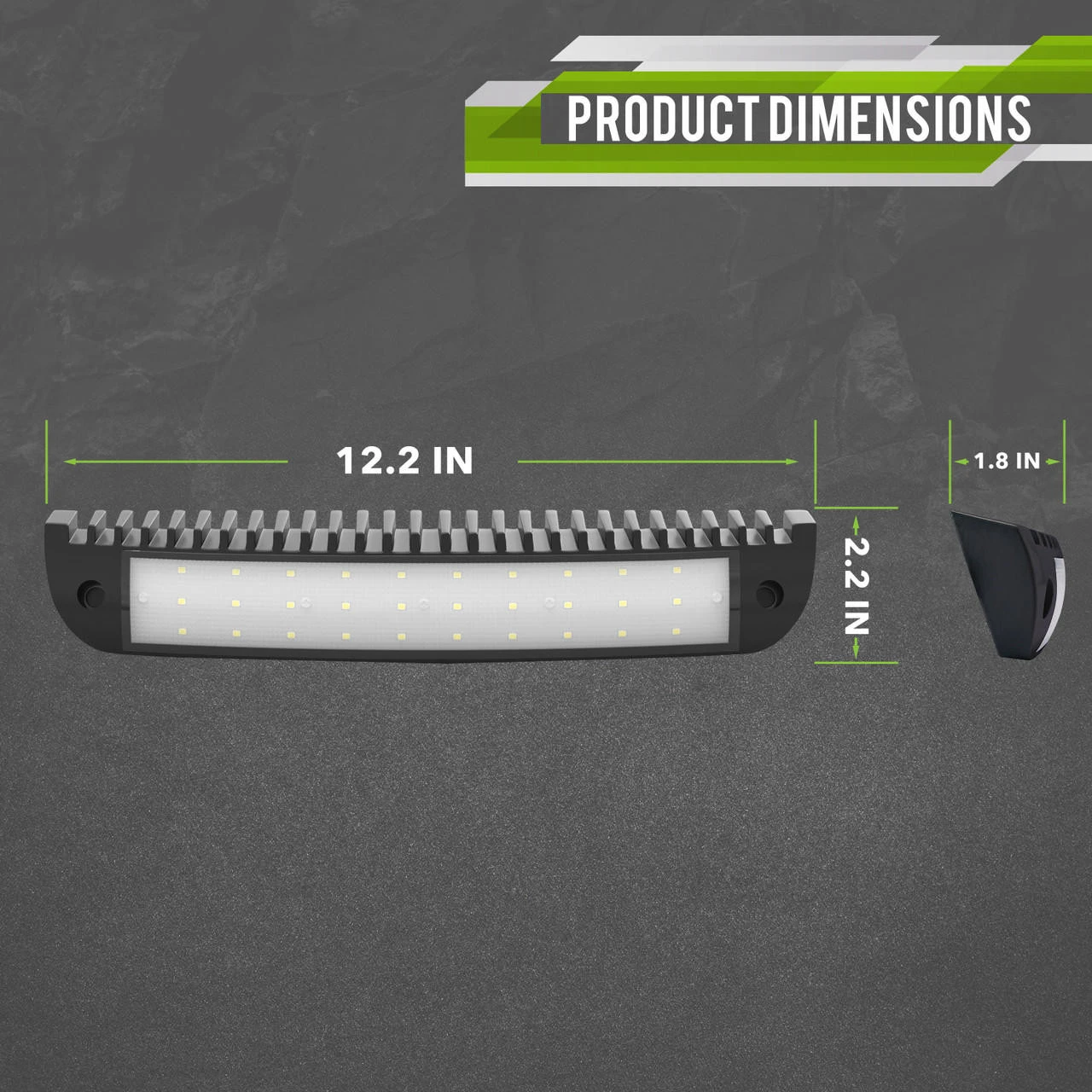 New LED Curved Porch Light Without Switch 2500LUM Cool White Description: LED Rectangle Porch Light Fixture 2500 Lumens Made with Environment-friendly technology and materials. Wide Voltage Range : 12-24 volts Applications include 12 Volts DC recreational vehicles. RV fluctuations can damage a regular LED. This LED is designed to withstand a wide operating voltage range. Beam Pattern : 120 degrees Color Temperature : 6000-6500K Cool White 30 High power LEDs. 30 Power Watts 50,000 hour life expectancy. Last many times longer than standard light bulb