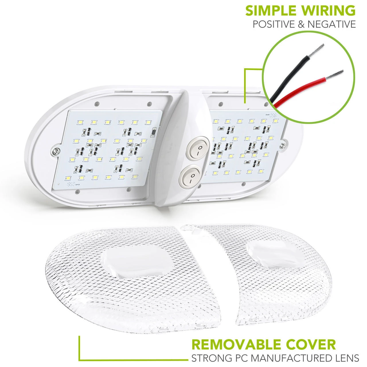 - Convenient ON/OFF Switches Design: built-in 3-way switch that enables you to use one side or both sides of the light independently; it adds great functionality to any area for lighting and it is widely used as perfect replacement light for Car/RV/Trailer/Camper/Motorhomes/Marine Boats.