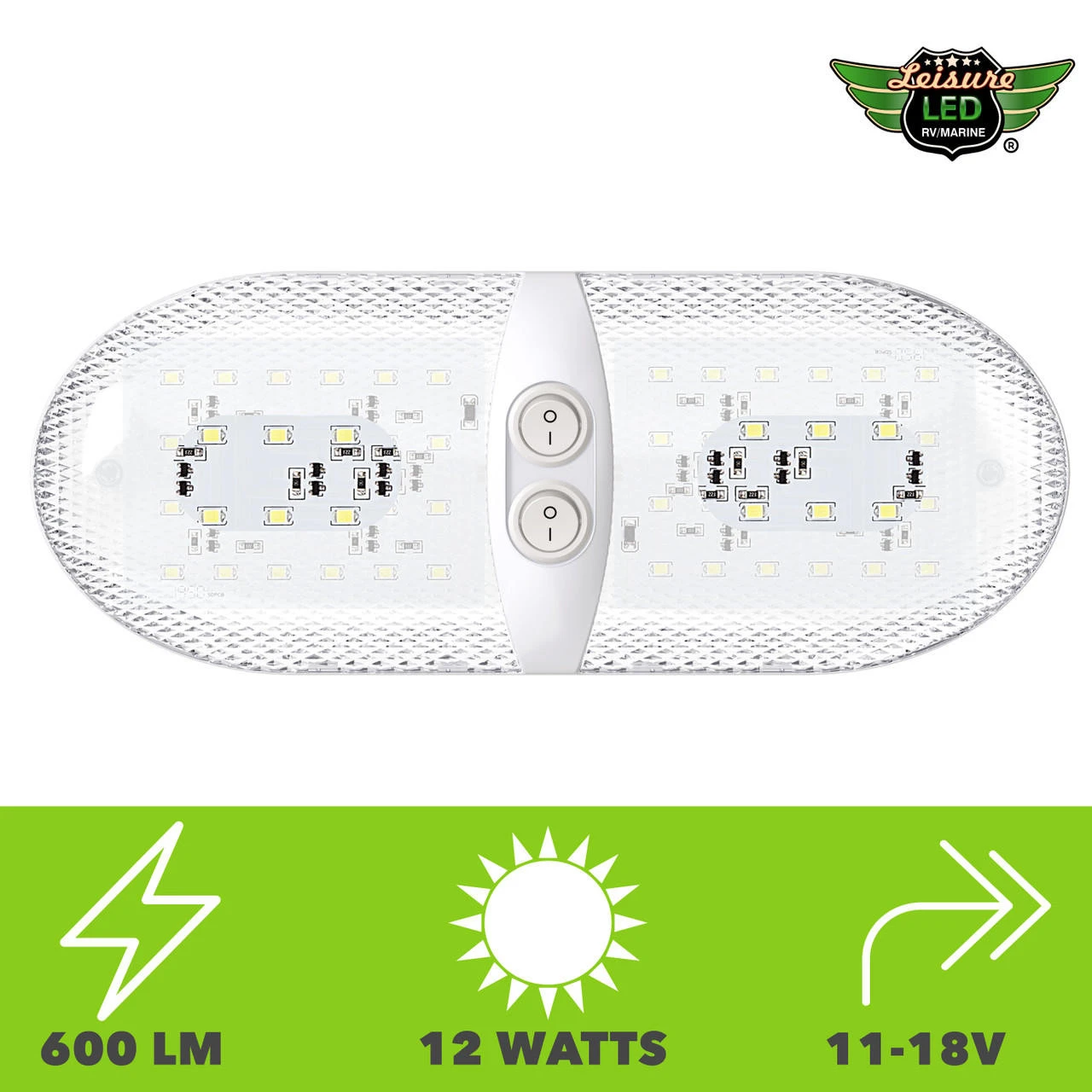 - Leisure LED Euro Style Double Dome Light Fixture Cool White 6500K 620 Lumens 48 2835SMD leds 11-18V Super Bright