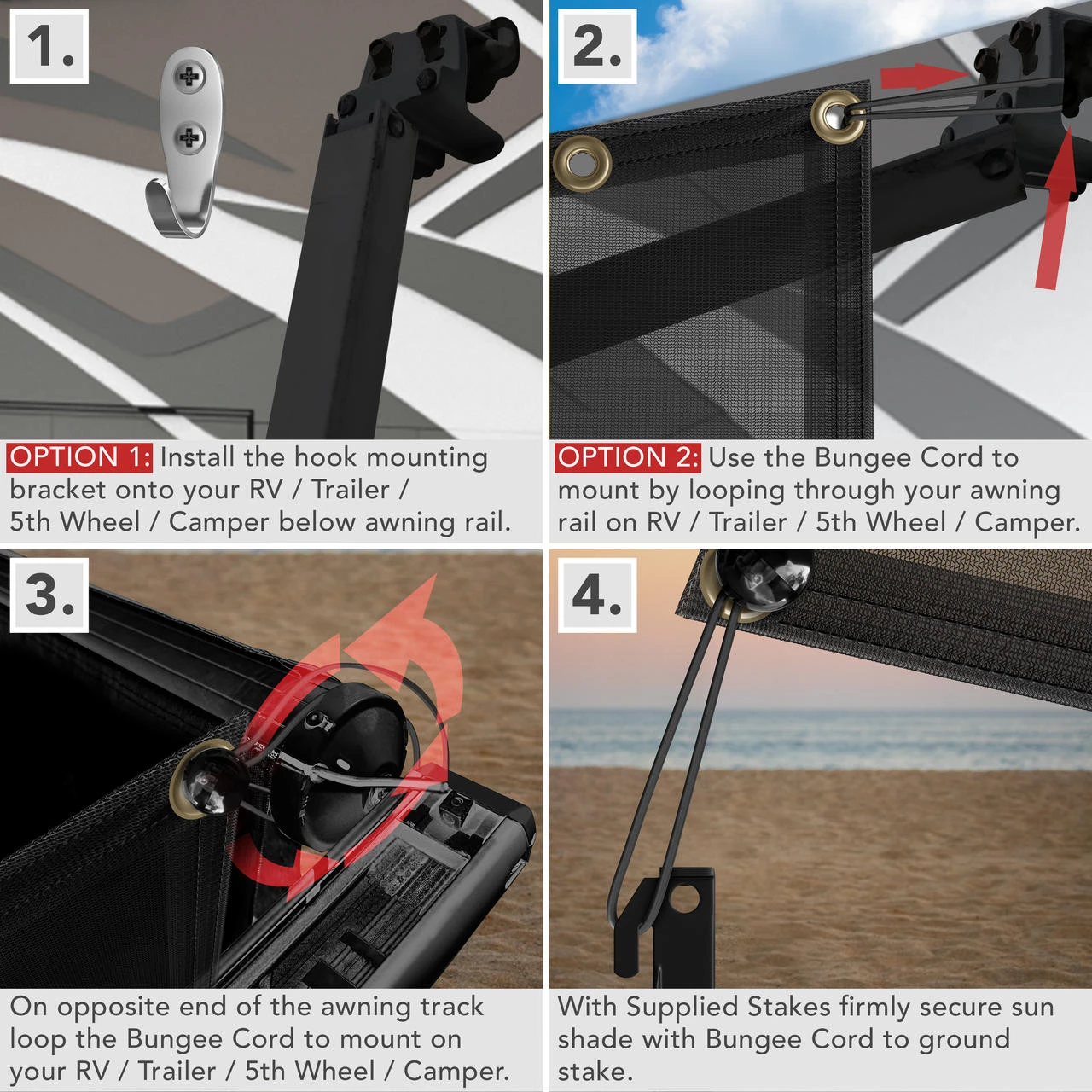 - EASY INSTALL & DISMOUNT – light weight and comfortable to touch. 2 plastic stakes, 1-3” and 3-13” bungees, 2 pieces of zinc alloy hooks and 4 stainless steel drilling screws. Storage bag included.