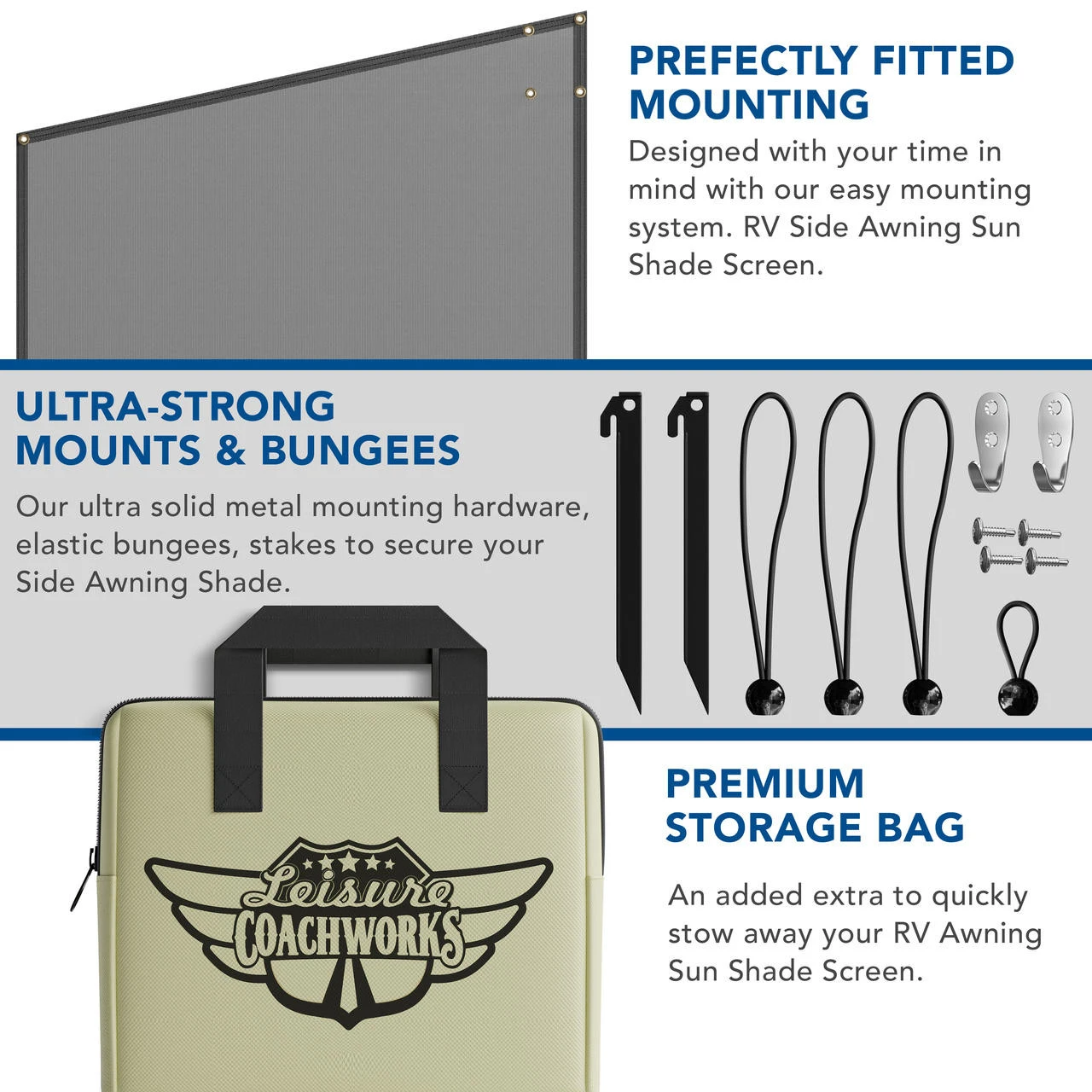 - Leisure Coachworks 9’x7′ Side SUN LIGHT BLOCKER – Approximated 86% sun light is blocked which provides a lower temperature immediately, and allows you to enjoy camping comfortably.