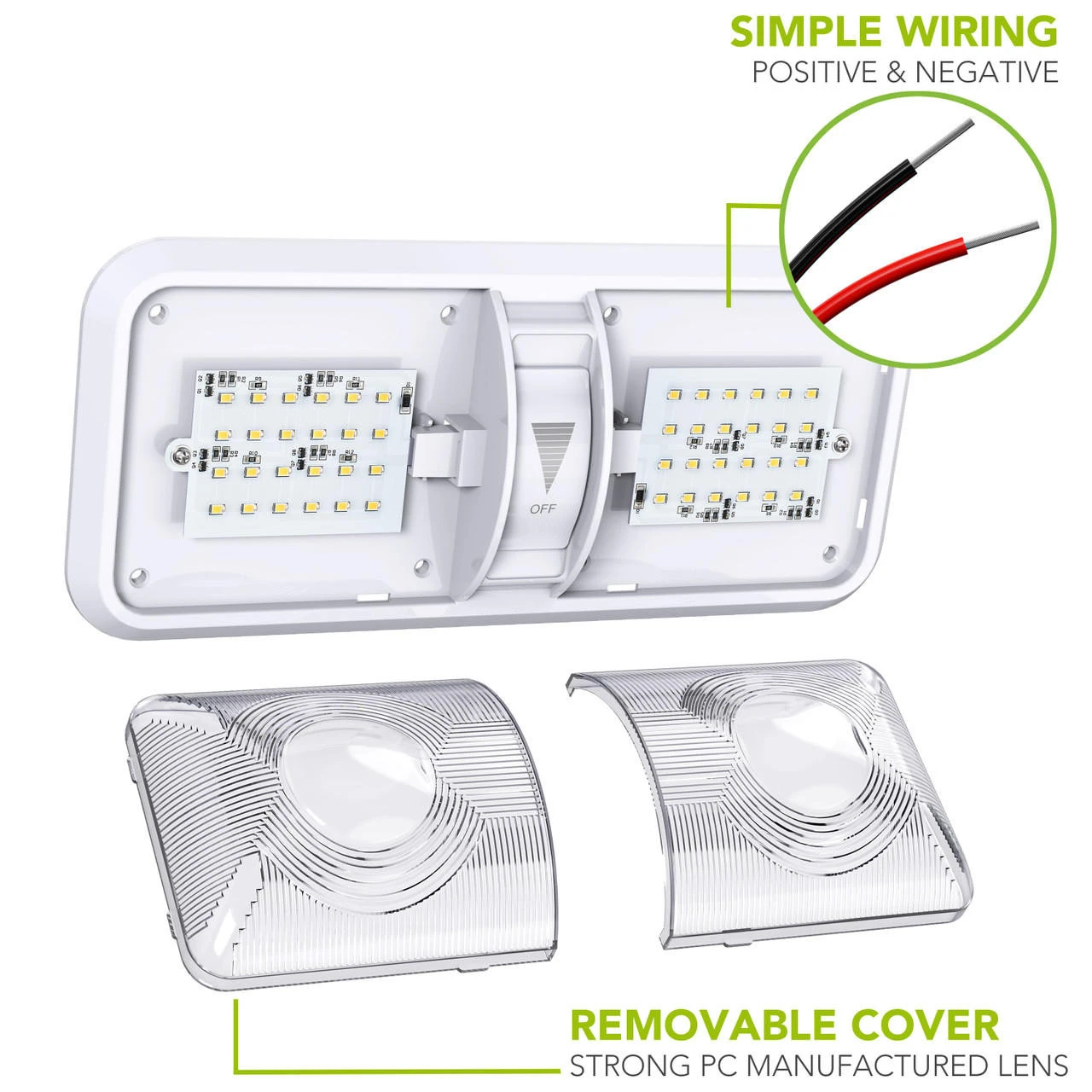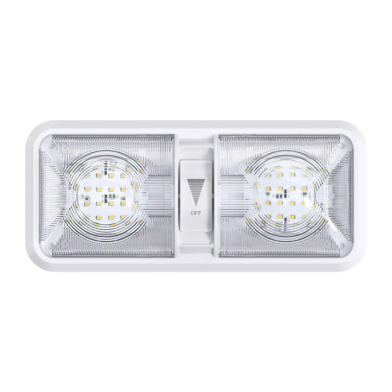 Double Dome Light Fixture 48 2835SMD chip leds, 2 x 275 Lumens Natural White With built in Dimmer switch RV, Marine & Auto 550 Total Lumen -Description- -Double Dome Light Fixture comes with two T10 Wedge panels 2 x 275 Lumens, LED Bulb -Built in Dimmer Switch -Applications include 12 Volts DC recreational vehicles. -Wide Range Use 11-18V – Color Temperature : 4000-4500K Natural White -2 x 24 High power Wedge style 2835 SMD LEDs -60,000 hour life expectancy. Last many times longer than standard light bulb -Dimensions: 11 1/4″L x 5″W x 2″H -Specification- -Fixture comes with a LED light bulb that is made with high quality SMDs