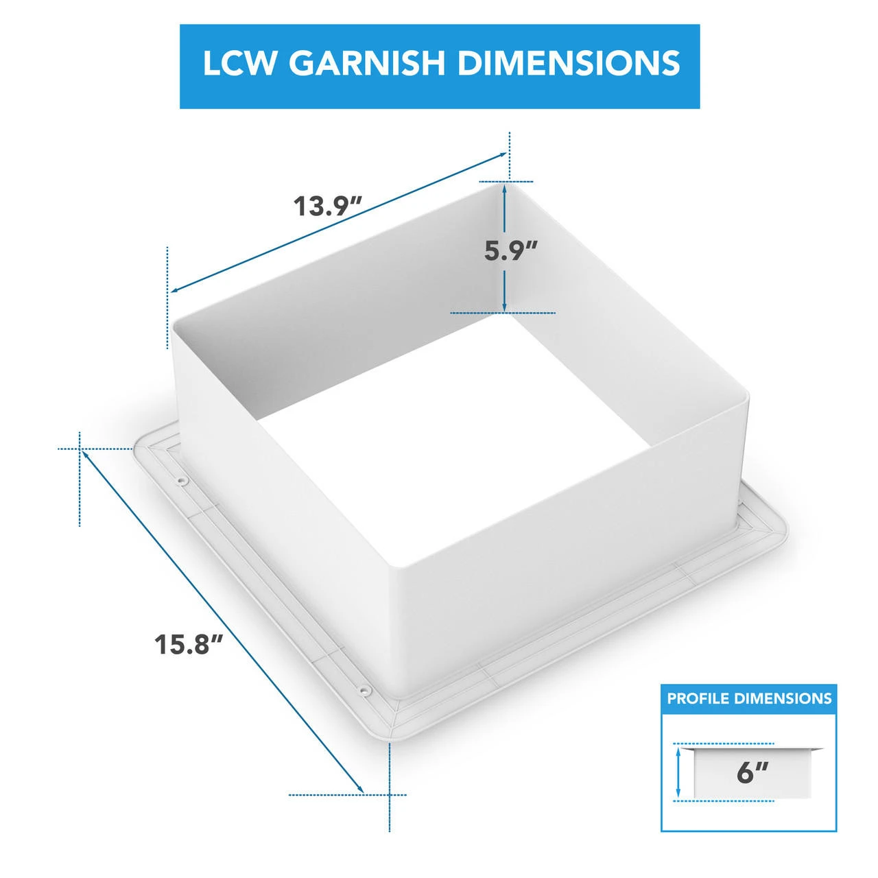The RV roof garnish measures 15.8” x 15.8” and 6” deep. Inner dimensions of the vent are 13.9” x 13.9” and 5.9” deep.