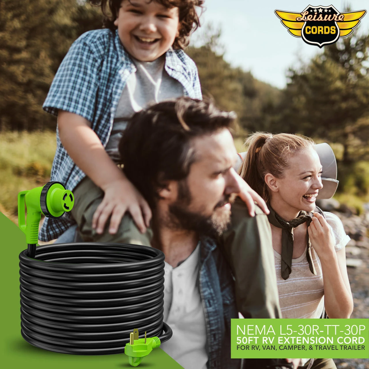 RV Twist Locking Power Cord – This 50 foot, 30 Amp 90 Degree locking power cord allows you to connect the campground or park power to your RV, Motorhome, Trailer or vehicle. The cordset is manufactured with the highest, marine-grade quality material and has unique features not found on other cordsets. LED power indicator glows greenwhen there is power. Watertight molded plug and connector ends for safety and durability. 50′, Heavy duty, super flexible marine grade cable (30 Amp 10 Gauge). 90 Degree Female Receptacle w/ Handle: reduces strain on cord withLED light 30 Amp, 125 Volt Locking. Attaches to RV inlet or cordset. Male Plug: with finger grip, 30 Amp, 125 Volt 2-Pole, 3-Wire RV use only with finger grip Attaches to pedestal receptacle or cordset. ETL and CSA Approved